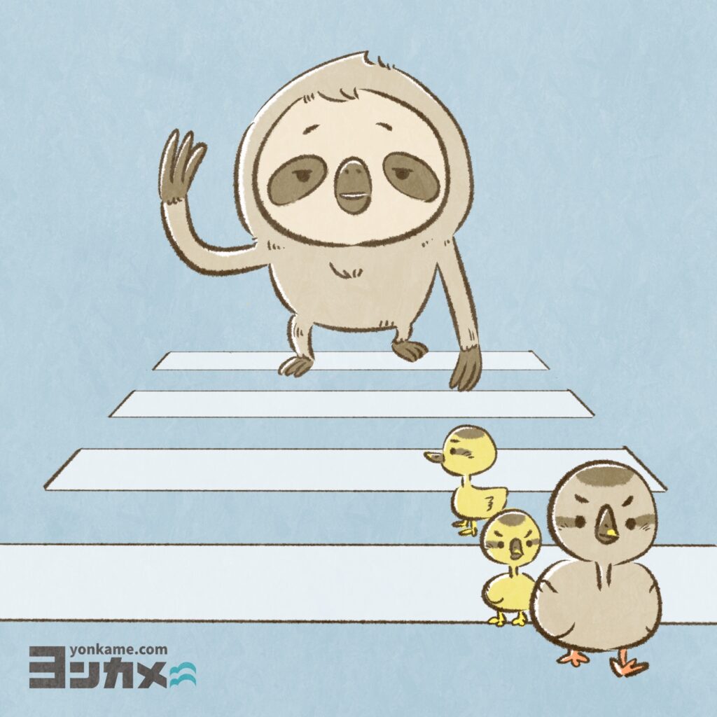 鳥の一家に続いて横断歩道を渡るナマケモノ。信号があるのかないのか分からないイラストですが、急いだほうが良さそうですね。(イラストはXに2023年4月9日投稿)