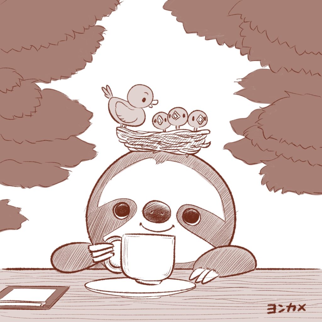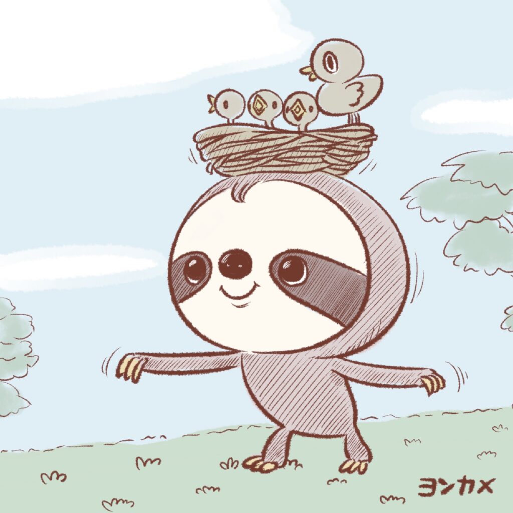 前回のナマケモノのイラストから2年以上経って描いたもの。のんびり過ごしていたら頭の上に鳥の巣ができた。というもの。なんとなく描いた割に気に入ってしまい、次回へ続くことになります。(イラストはXに2025年7月24日投稿)