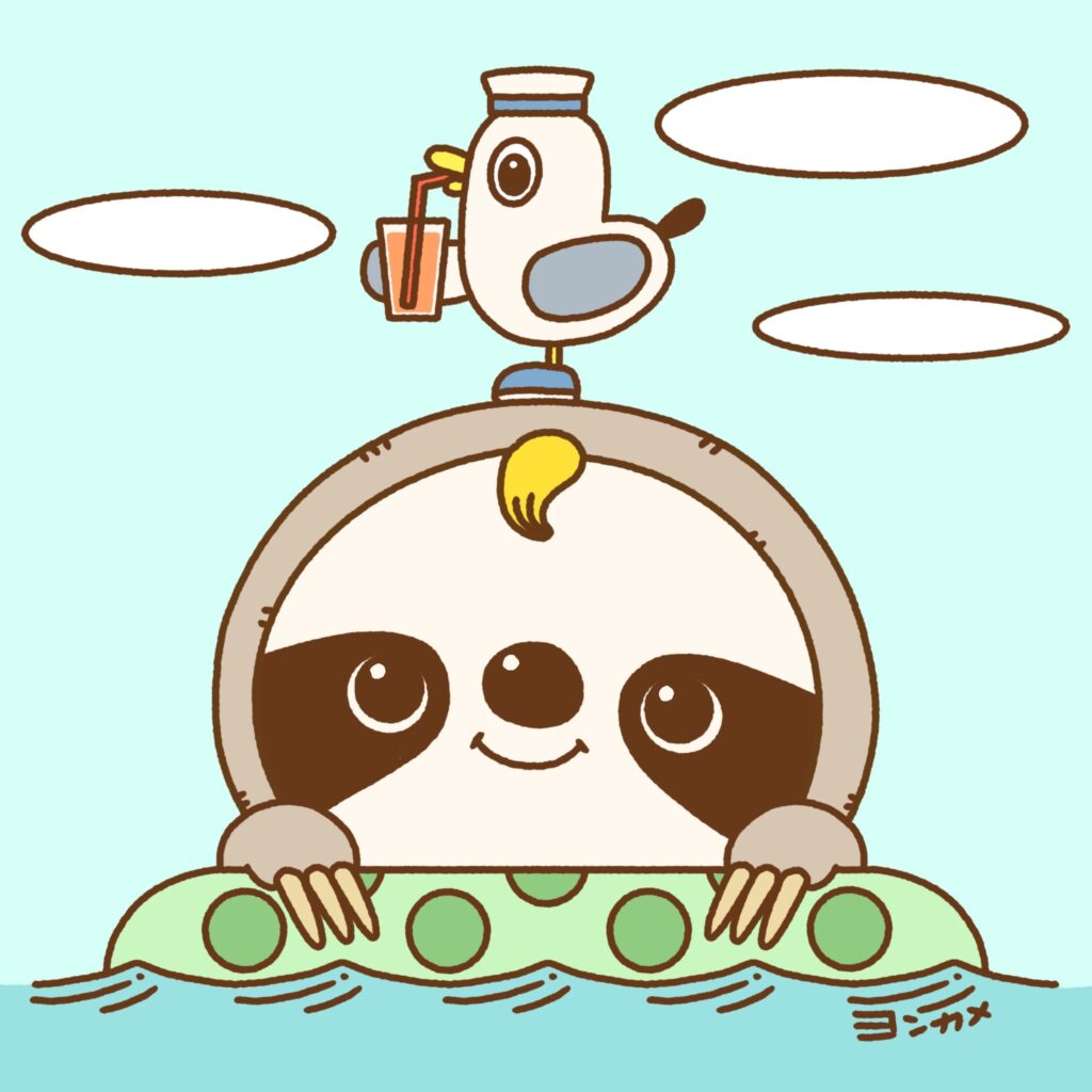 頭の上に鳥の巣があったナマケモノをベースに顔を調整して着色したナマケモノ。今度は浮き輪を持って海水浴中にかもめが頭でひとやすみ。(イラストはXに2025年8月21日投稿)